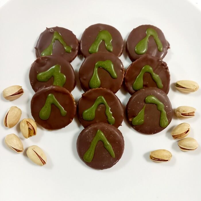 こだわり2:外側のミルクチョコとフィリングのホワイトチョコのやさしい甘さが、ピスタチオの風味を引き立て、贅沢な味わいを実現。どなたでも楽しめる一品です。